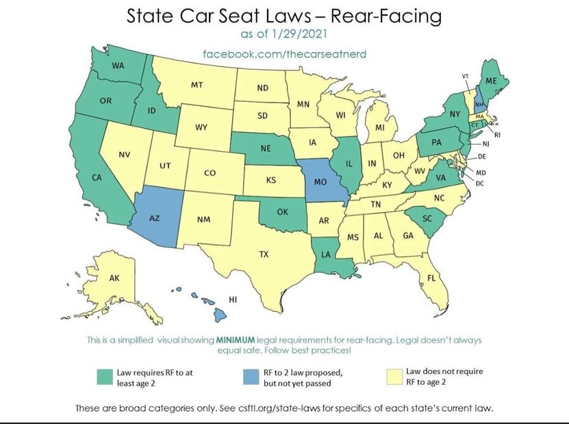 This map is ever-changing as lobbying continues. Rear-facing until at least age 2 is required by the states in green and has been proposed in the blue states but has not yet passed. The yellow states do not have requirements to rear-face until at least age 2 yet. Please note this map can change frequently so always check with your state's laws.